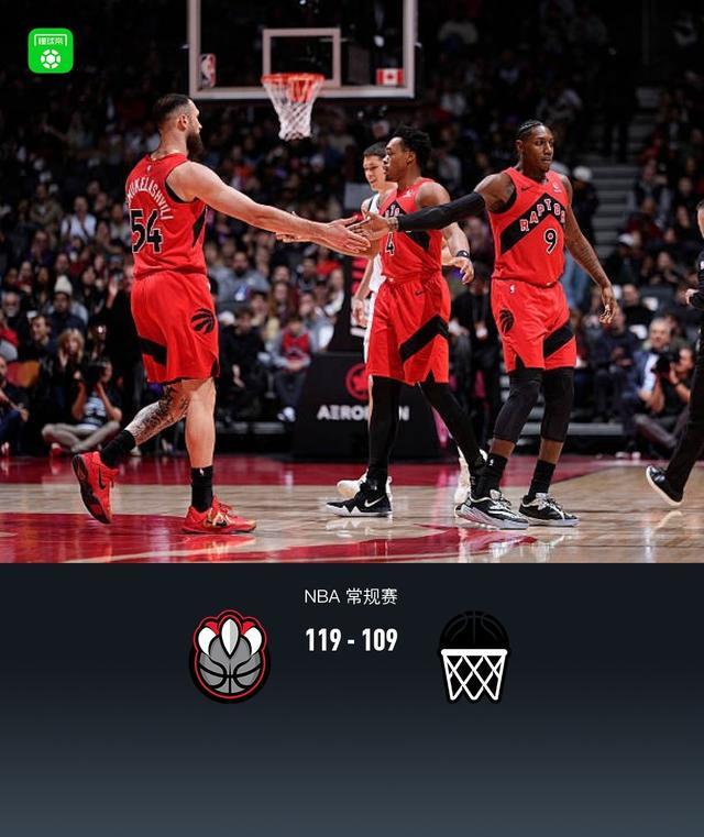 第四节猛龙奎克利拿下8分,篮网泰雷斯-马丁拿下10分,最终猛龙119-109战胜篮网